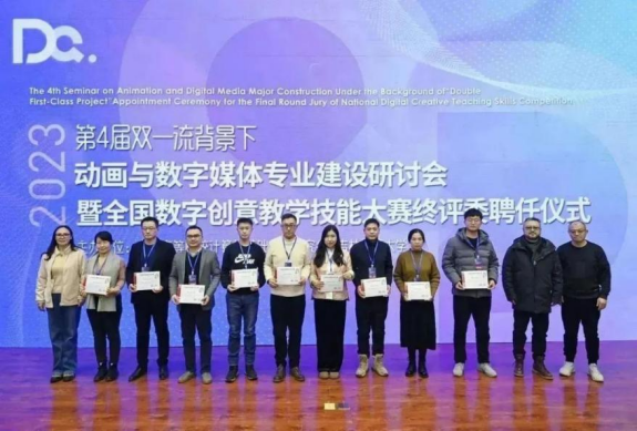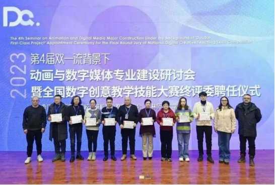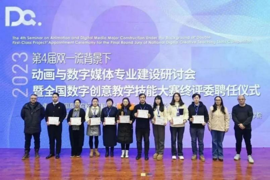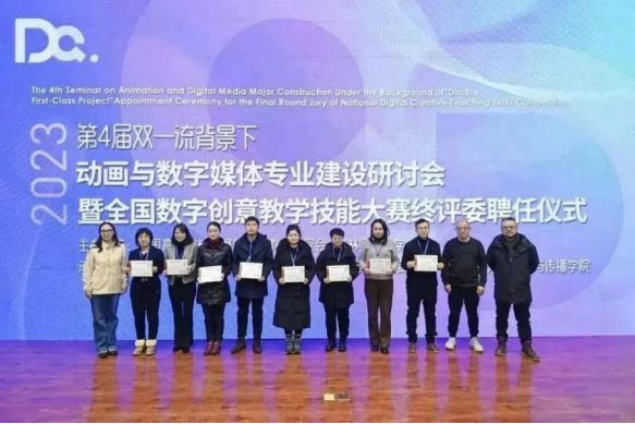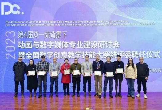 会议最后,谢清风秘书长为受聘全国数字创意教学技能大赛终评委专家颁发聘任证书,并合影留念。我院院长夏维波教授、动画系主任王军华副教授、数字媒体艺术系姜旬恂副教授受聘为大赛终评委。