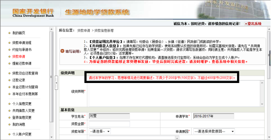 注:续贷学生需要登录学生在线服务系统提交本人续贷申请声明,并且每年至少两次登录学生服务在线系统否则将影响续贷。