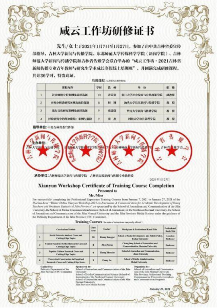 2月7日,来自全国77所高校的268位师生收到了“咸云工作坊·2021吉林省新闻传播专业青年教师与研究生学术成长寒假线上培训班”的研修证书。
