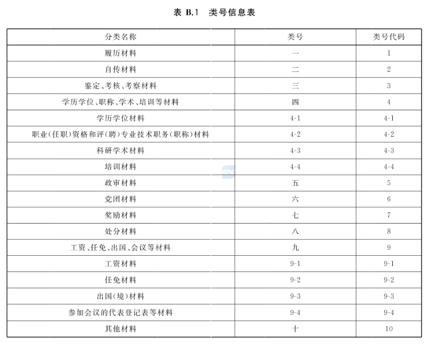 干部人事档案内容应分为十类:其中第四类和第九类分为4小类。分类的编号,形式为大写一到十。其中第四类中的小类用4-1到4-4表示,第九类中的小类用9-1到9-4表示,见表B.1。