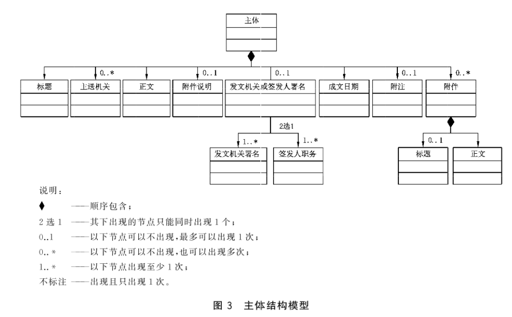 公文主体由标题、主送机关、正文、附件说明、发文机关或签发人署名、成文日期、附注、附件等要素组成,其结构模型见图3。