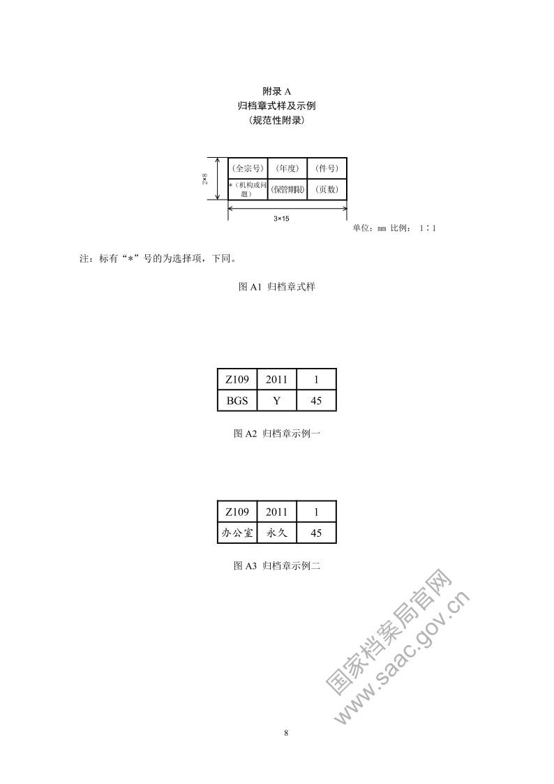 5.4.5 归档章应将档号的组成部分,即全宗号、年度、保管期限、件号,以及页数作为必备项,机构(问题)可以作为选择项(见附录 A 图 A1)。归档章中全宗号、年度、保管期限、件号、机构(问题)按照 5.4.3 编制,页数用阿拉伯数字标识(见附录 A 图 A2)。为便于识记,归档章保管期限也可以使用“永久”“30 年”“10 年”简称标识,机构(问题)也可以用“办公室”等规范化简称标识(见附录 A 图A3)。
