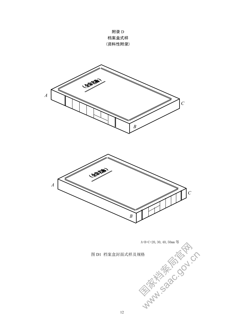 6.4.1.1 档案盒封面应标明全宗名称。档案盒的外形尺寸为 310mm×220mm(长×宽),盒脊厚度可以根据需要设置为20 mm、30mm、40mm、50mm 等(见附录 D 图 D1)。