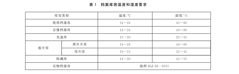 5.1.2 档案库房温度和湿度应符合表1的要求。