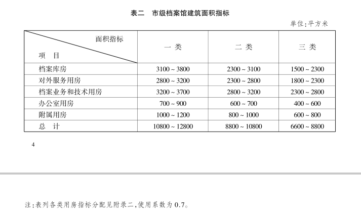 关于使用系数,本标准以现存档案馆两种最为常见的建筑模型进行推算,分别计算出的使用系数分别为70﹪和65﹪,结合调研结果以及反馈的意见,本标准将使用系数确定为70﹪,即0.7。