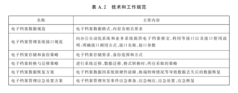 6.3 技术和工作规范名称及主要内容宜参照表 A.2制定。技术和工作规范应与 6.2 协调配合,明确电子档案数据规范、电子档案管理系统接口规范、电子档案存储和备份策略、电子档案转换与迁移策略、电子档案数据恢复方案、电子档案管理应急处置方案。