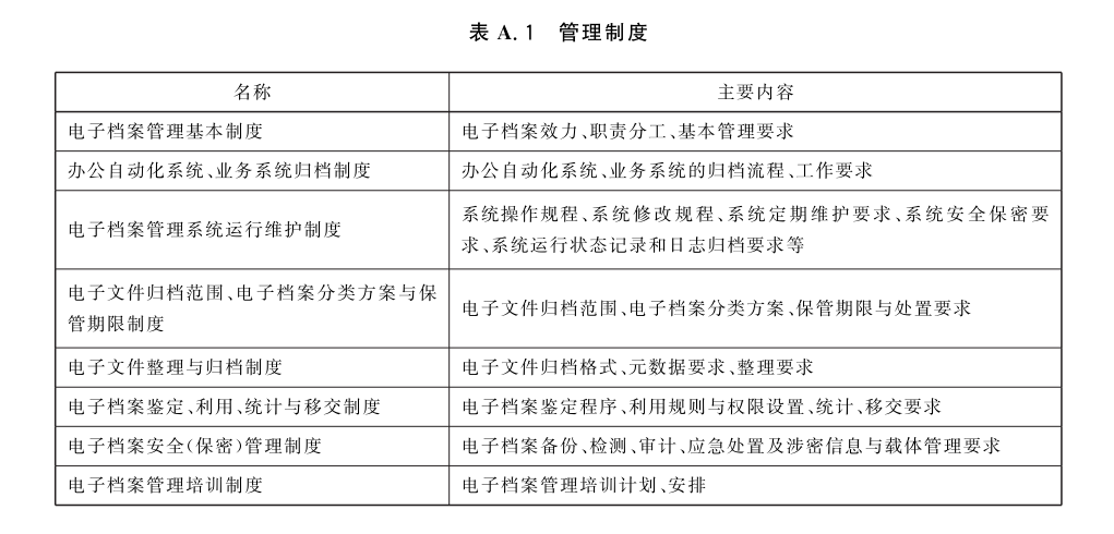 6.2 管理制度名称及主要内容宜参照附录 A 的表 A.1制定。管理制度应规定或明确电子档案效力和各部门职责分工,办公自动化系统、业务系统、电子档案管理系统管理流程和运行维护要求,电子文件归档范围,电子档案分类方案与保管期限表,电子文件整理、归档要求,电子档案鉴定、利用、统计与移交要求,电子档案安全(保密)管理要求,电子档案管理培训要求等。管理制度可以根据需要单独或合并制定。