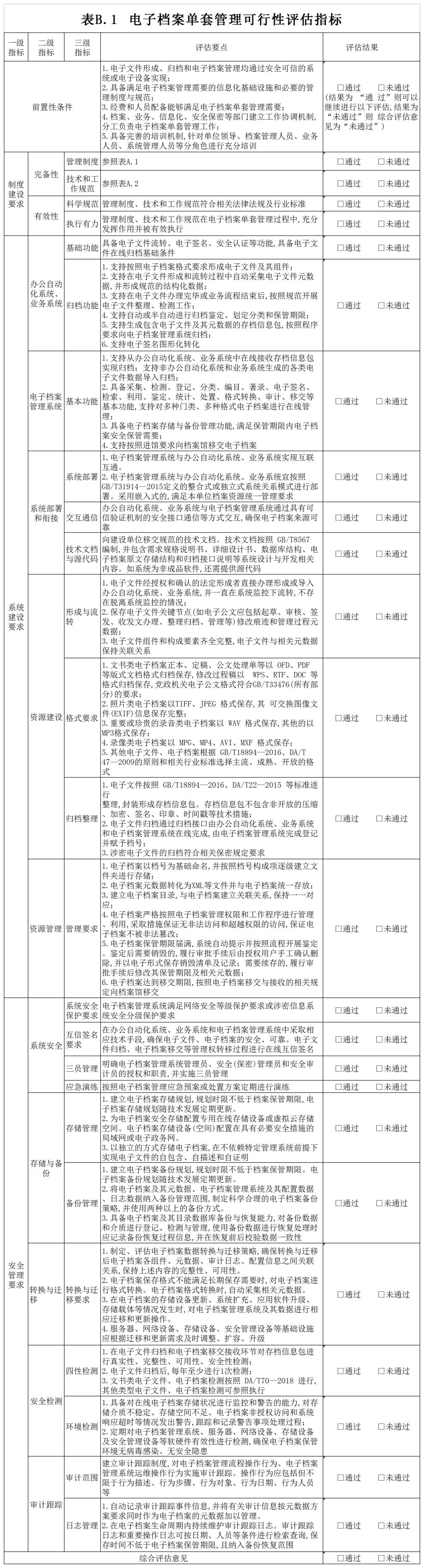 B.1 规定了电子档案单套管理可行性评估各级指标及评估要点和评估结果。