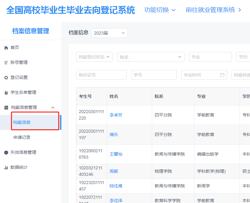 1. 完善《学生档案转递信息汇总表》(2023.07),今年先由就业处直接导入,从2024年开始由各学院负责维护“档案信息管理”模块。