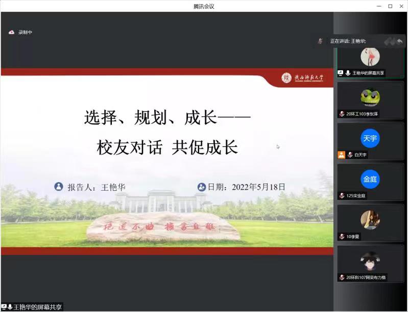 5月18日晚19点,我院组织开展了“选择、规划、成长—校友对话、共促成长”专题报告会。报告会由我院第一届本科毕业生,陕西太阳成集团tyc122cc入口环境科学与工程系副主任,硕士研究生导师,王艳华副教授主讲。会上,王艳华结合自身学习、工作、科研经历与同学们一起分享和介绍了自身的成长过程与经验,鼓励同学们热爱环境专业、努力学习专业知识,积极做好考研准备,同时耐心的回答了同学们提出的各项问题。报告会由任百祥院长主持,我院大一至大三年级全体同学参加了报告会。