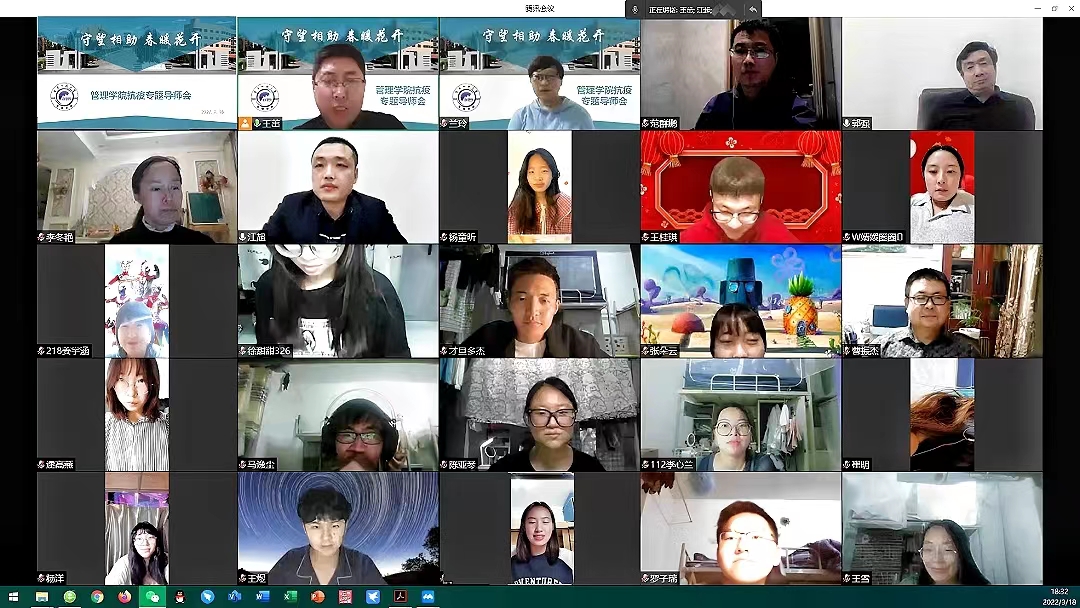 疫情无情人有情,师生同心保平安,2022年3月18日18:30,学院通过在线会议召开了以“守望相助 春暖花开”为主题的抗疫专题导师会。学院全体领导班子、部分教师及2021级全体同学参加了会议,副院长王茁主持会议。参会师生全程认真投入,反应积极热烈,纷纷表达了取得抗疫胜利的信心和决心。