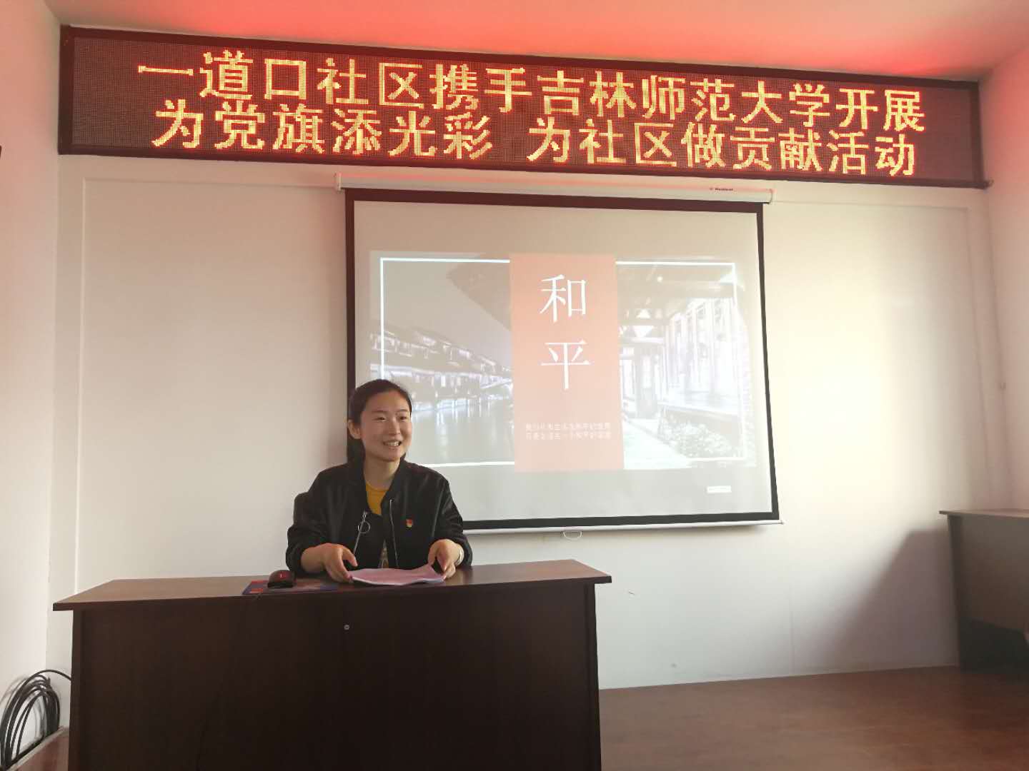 应四平铁西区北沟街道一道口社区党支部的邀请,学生党员马慧以“我们生活在和平的国家”为主题,为全体社区干部同志讲党课。以今天的叙利亚和抗日战争年代的中国为背景,分析出弱国无外交,落后就要挨打的道理,以图片和数据的形式还原了无数革命先烈为创建新中国抛头颅洒热血的历史画面,让在场的每个人都深受感动。会后,全体师生义务为社区清理小广告,打扫公共卫生。大家热情高涨,以劳动为荣,乐在其中。