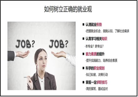 讲座中,陈清清强调树立正确就业观的重要性,应避免缺乏客观自我评价、就业期待过高、过于看重收入、期望一步到位等认知偏差,以帮助学生确立理性的职业生涯初始规划。此外,陈清清通过历年毕业生的就业率、求职意向、招聘企业类型等数据,向同学们分析了未来严峻的就业形势,并推荐了综合性招聘网站、校园宣讲会、企业官网和自媒体公众号等。最后,陈清清向同学们介绍了面试礼仪、面试技巧,以及求职过程中面试官主要考察指标等。