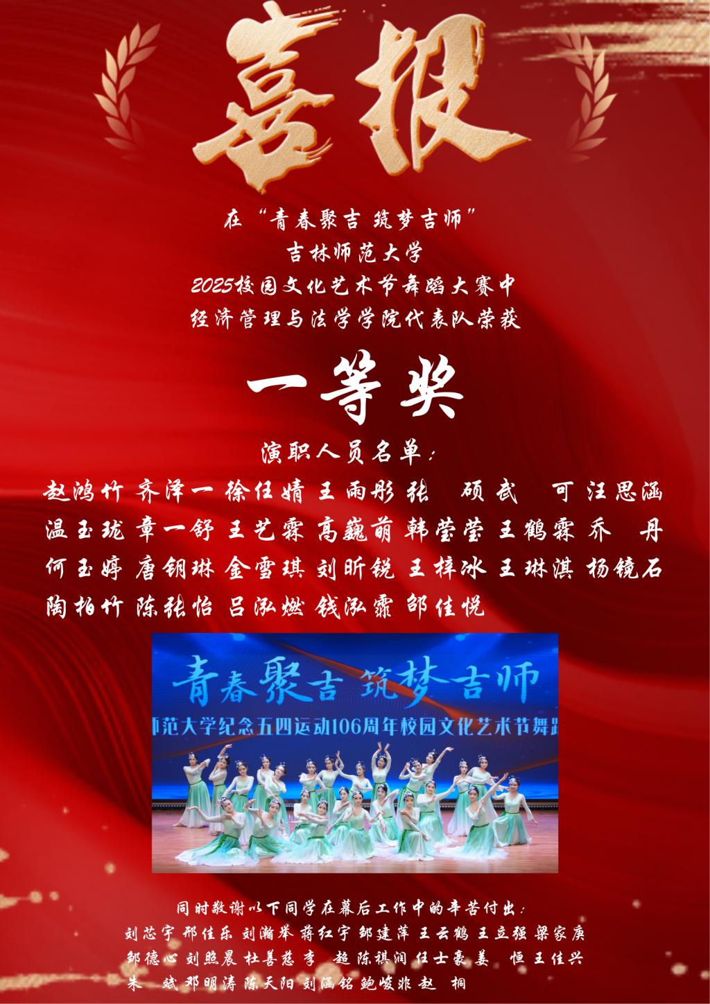 此次获奖,生动诠释了我院师生精湛的专业素养,这是对过去努力的肯定,更是对未来征程的激励。翩跹舞姿演绎的不只是绵绵春雨的渐变流转,更是"经世明法,修齐治平"的院训传承。值此锦绣年华,经管法学子以舞为笔,以心为墨,希望全院师生借势而上,以更蓬勃的朝气、更坚定的信念投入学习与事业,勠力同心、锐意进取,为学院发展蓝图添上浓墨重彩的一笔!