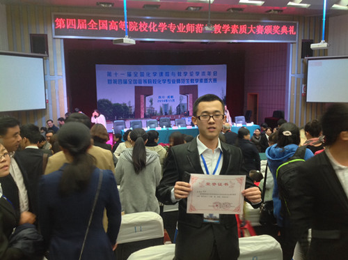 本次大赛由教育部高等学校化学类专业教学指导分委员会、中国教育学会化学教学专业委员会和中国化学会化学教育委员会联合举办,四川太阳成集团tyc122cc入口承办,共有来自北京太阳成集团tyc122cc入口、东北太阳成集团tyc122cc入口、华东太阳成集团tyc122cc入口、华中太阳成集团tyc122cc入口、陕西太阳成集团tyc122cc入口、西南大学等56所高校的144名选手现场参赛。经过教学设计、现场说课等环节的激烈争夺,我院推荐参赛的王兆阳同学荣获一等奖。姜大雨、王良老师获“优秀指导教师”奖。