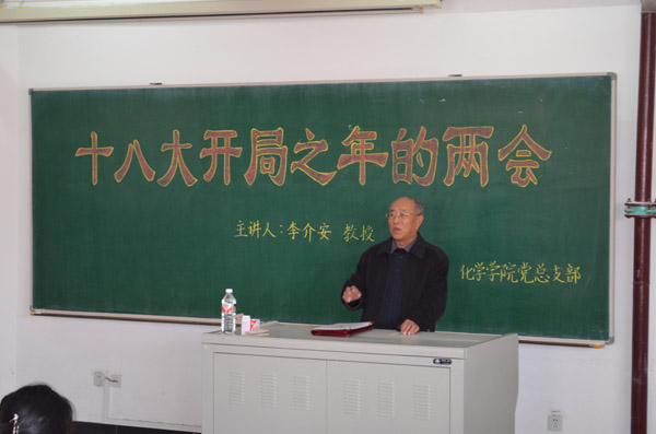 为深入学习宣传贯彻2013年两会精神,4月10日下午,化学学院党总支邀请校关工委副主任李介安教授,在十教10623教室作了《十八大开局之年的两会》报告会。报告会由院党总支书记、关工委主任陈明宏主持,党总支副书记于新春、分团委副书记张雷、关工委常务副主任赵树岚出席会议。教师、学生党员,非党积极分子,2012级学生听取了报告。