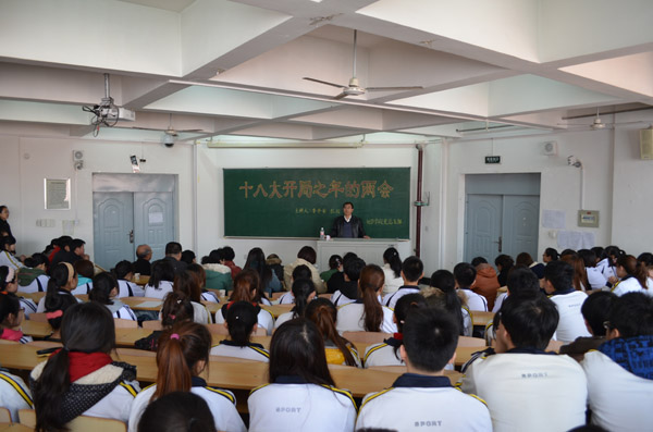李介安教授首先以习近平总书记提出的“中国梦”为切入点,深入浅出剖析了中国经济发展对世界的影响与意义,归纳得出十八大开局之年的两会是世界发展史上的里程碑。李教授生动有趣的讲解让与会师生明白了什么是中国梦,明白了只有怀着自己的梦想才能唱响民族复兴的中国梦。最后,李教授还号召广大师生倡导简洁,积极配合“光盘”行动,让节俭之风吹遍校园。