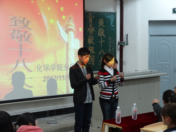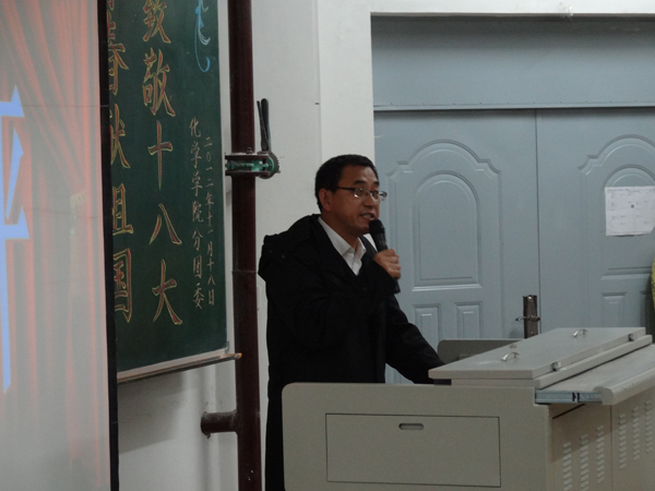 为深入宣传贯彻十八大精神,化学学院分团委于11月18日晚在十教10623教室举办了“青春献祖国致敬十八大”主题团日活动。化学学院党总支书记陈明宏出席并作了讲话,他说,要认真领会十八大精神实质,迅速掀起全院师生学习宣传贯彻落实十八大精神的热潮。