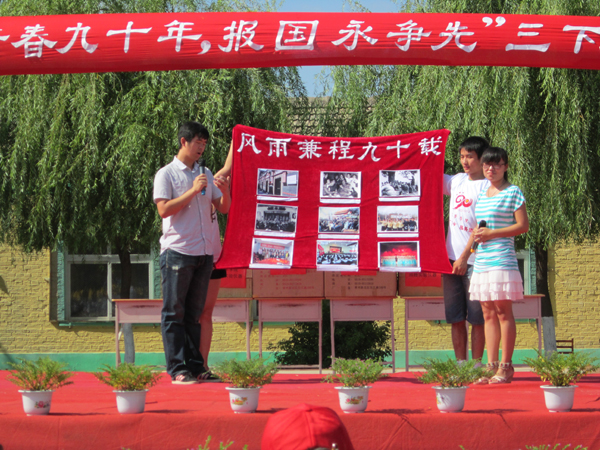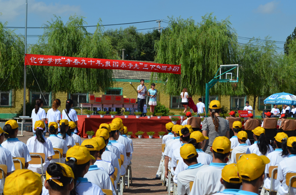 为贯彻落实胡锦涛在纪念建团90周年大会上的讲话精神,宣传共青团90年发展道路和巨大变化,2012年8月25日,化学学院“三下乡”服务团来到铁东区长发乡所在的四平市第九中学,组织开展了以“青春九十年,报国勇争先”为主题的“三下乡”活动。学院党总支书记陈明宏、副书记于新春、副院长崔运成、团委副书记张雷和铁东区教育局副局长王淑梅、四平市第九中学校长高晓波等领导出席了此次活动。