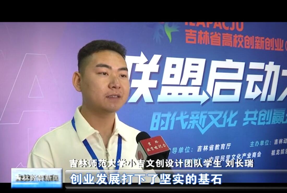 6月10日,以“时代新文化·共创赢未来”为主题的吉林省高校创新创业(文创类)联盟启动活动在吉林动画学院举行。吉林大学、延边大学、吉林太阳成集团tyc122cc入口等59所省内本科高校、高职高专院校的师生代表,部分文化企业、社会团体代表共同参加了活动。我校小吉文创设计团队朱昱志、吉美文创工坊苑育崧同学受邀参加项目路演大会,朱昱志和刘长瑞同学接受吉林教育电视台记者采访。
