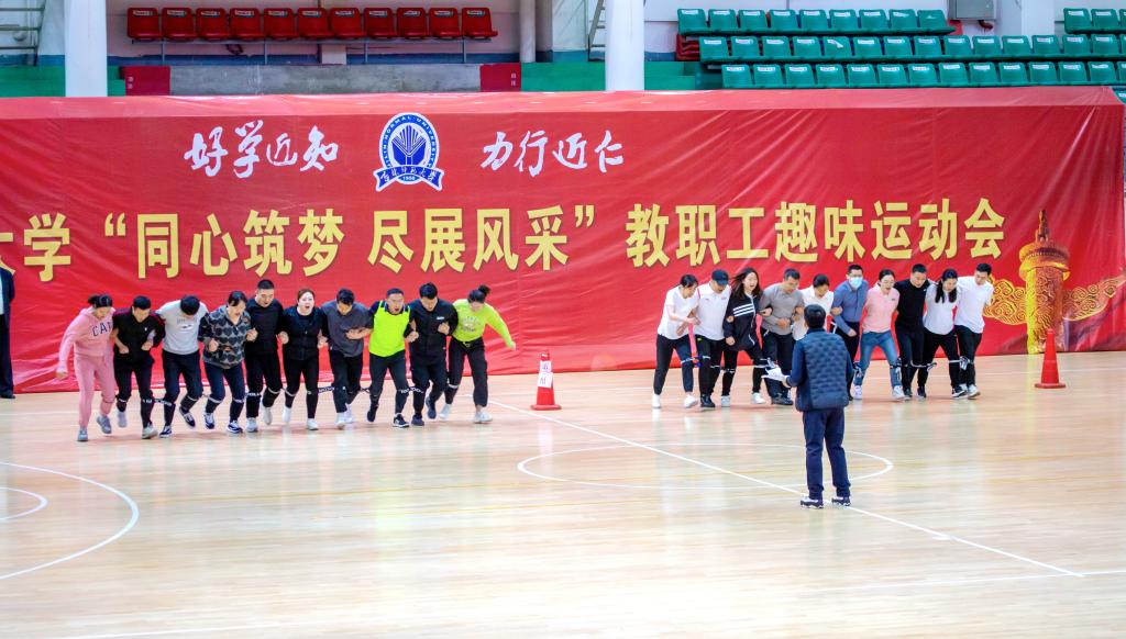 5月17日,学校在体育馆举行2023年“同心筑梦,尽展风采”教职工趣味运动会。党委书记王喜库、党委副书记赵经武出席活动。工会委员会委员、妇委会委员及各单位党政负责人现场观看比赛,全校19支参赛队伍近400人参加比赛。
