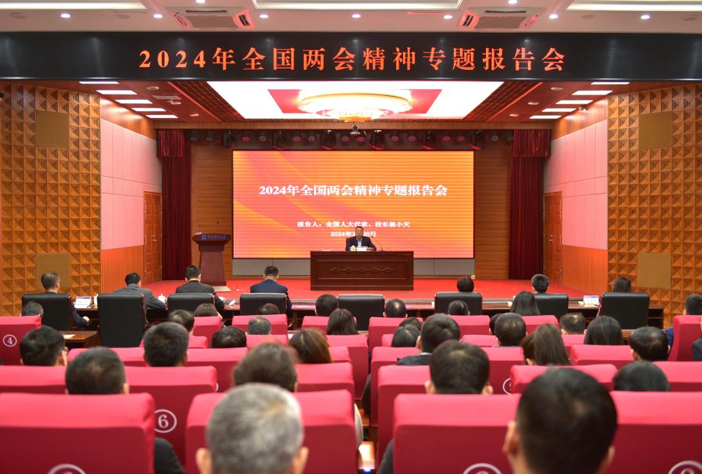 3月20日,全国人大代表、校长杨小天作全国两会精神专题报告。党委副书记韩金玉、赵经武,纪委书记、监察专员于荔欣,党委常委、副校长左今明、吴振利、邢宇、马光焱出席报告会。全校各单位党政负责人、各级人大代表、政协委员、各民主党派负责人、无党派人士代表、青马学员聆听报告。赵经武主持报告会。