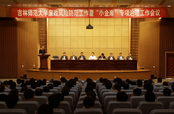 为深入推进反腐倡廉建设,拓展从源头治理腐败工作的有效途径,贯彻落实《吉林省高等学校廉政风险防范工作试点的实施方案》和《吉林省2011年“小金库”专项治理工作实施方案》的要求,进一步加强学校党风廉政建设,构建具有特色的惩治和预防腐败工作的长效机制,保证和促进各项事业稳定、和谐、持续发展,6月1日下午,学校在图书馆报告厅召开廉政风险防范工作暨“小金库”专项治理工作会议。校党委书记张波,校长张伯军,校党委副书记张振华、高林波,副校长齐奎、杨景海、祖国华、张勇,校纪委书记王亮出席会议。机关全体工作人员,各教学、研究单位副科级以上干部参加了会议。