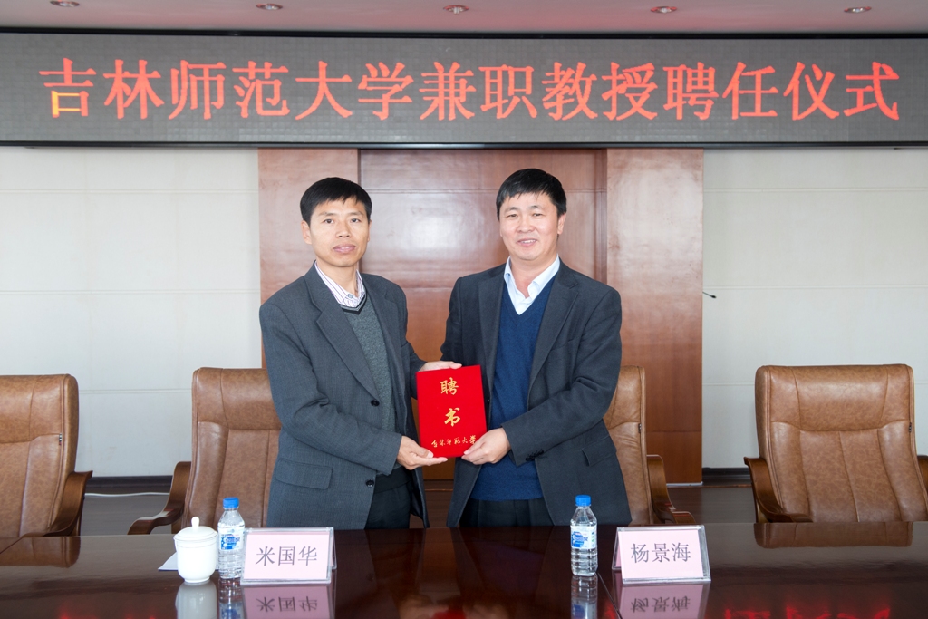 近日,我校在第一教学楼八楼会议室举行兼职教授聘任仪式,聘任米国华教授为我校兼职教授。校长杨景海、校长助理李海波出席聘任仪式。李海波主持聘任仪式,杨景海为米国华颁发聘书。科研处、旅游与地理科学学院负责人及相关教师参加了聘任仪式。