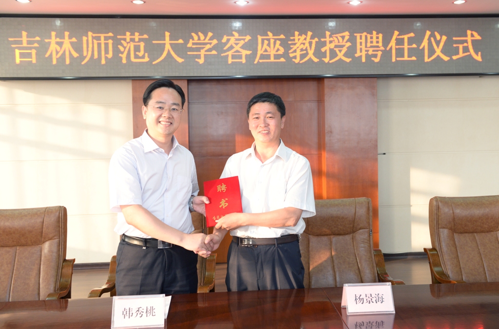 6月17日下午,我校在第一教学楼八楼会议室举行客座教授聘任仪式,聘任四平市委常委、副市长韩秀桃博士为我校客座教授。校党委书记张波出席聘任仪式并致辞,校长杨景海出席聘任仪式并为韩秀桃颁发聘书。副校长祖国华主持聘任仪式。校长助理李海波、科研处、人事处及政法学院负责人及相关教师参加了聘任仪式。