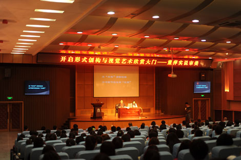 董萍实先生作了题为《开启形式创构与视觉艺术欣赏大门——董萍实说审美》的主题讲座。讲座围绕“形式意味”、“艺术本体问题”、“ 书画作品评价标准”等问题展开,董先生旁征博引、深入浅出地把多年的艺术思考和研究体验与师生共同分享,整场讲座精彩纷呈,在场的师生都有耳目一新的感觉,尤其在形式语言的建立、抽象艺术的审美欣赏等方面收获颇丰。