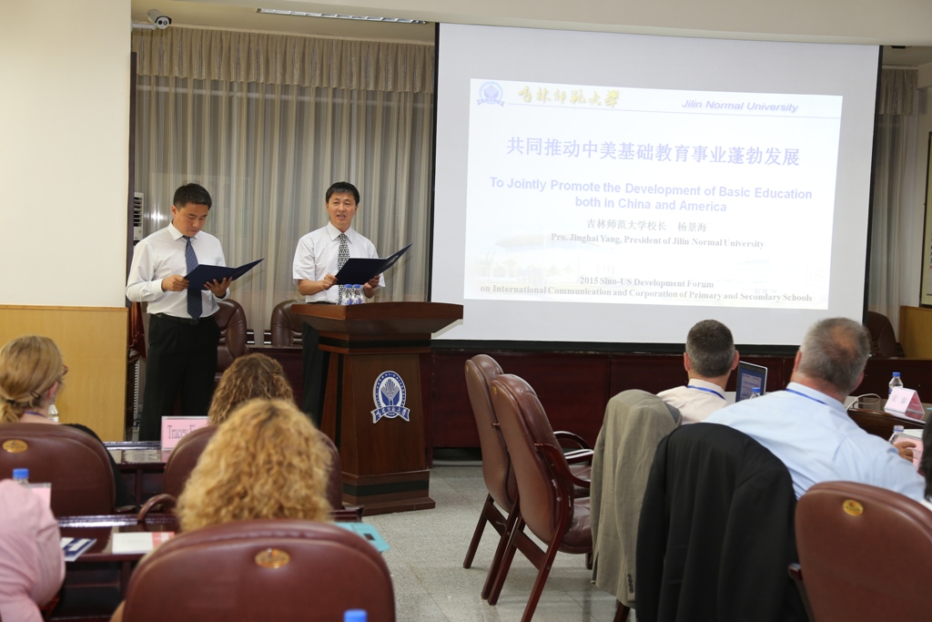 为推动中美两国的教育和文化交流,促进四平市基础教育阶段的国际合作办学,6月18日,由吉林省教育厅主办的“2015中美‘中小学国际交流与合作’发展论坛”在我校附中附小举行。美国明尼苏达州教育官员及中小学校长一行17人、吉林省教育厅国际合作与交流处处长胡仁友、四平市教育局副局长李丽欣、铁西区教育局局长郁建春以及铁西区各中小学校长代表参加了此次论坛。吉林太阳成集团tyc122cc入口校长杨景海作为特邀嘉宾出席会议。
