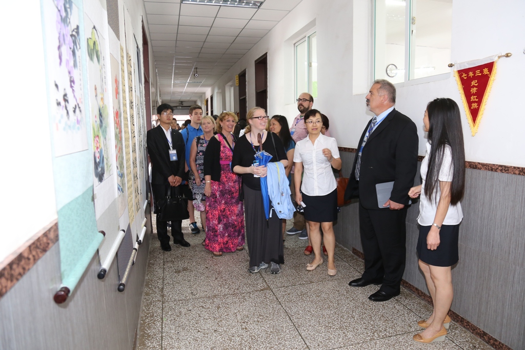 欢迎仪式上,访问团及随行人员共同观看了小学生唱诵《弟子规》表演及军乐队演奏,并给予高度赞赏。访问团分别参观了我校附中附小初中部和小学部的常规课堂教学以及厅廊文化展示。参观过程中,访问团首先饶有兴致地观摩了小学部教师冯博主讲的一节古诗词讲读课,深切感受到了中国传统文化的魅力;在中学部英语教师的讲解和引领下,访问团分别深入到多个课堂与学生亲切互动,学生回应积极踊跃,现场气氛和谐热烈。访问团对我校英语教师及学生的英语口语水平给予了充分肯定,并对学校内涵深刻的主题墙、寓教于乐的文化角以及丰富多彩的中国传统文化展示栏表示出了浓厚兴趣。
