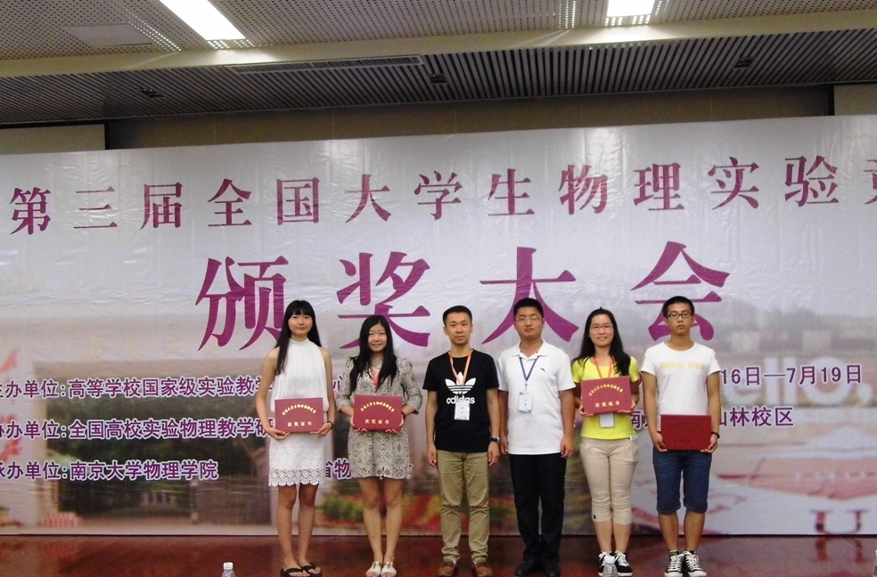 7月18日,第三届全国大学生物理实验竞赛在南京大学落下帷幕。包括北大、清华、中国科技大学以及我校在内51所高校的194名选手参赛。经过激烈角逐,我校由贾洪声、王丽、陈潇潇老师指导的物理学院2013级张丽莹、刘洋同学在本届竞赛中表现突出,分别在两个基础性实验项目中荣获三等奖;由刘洋和赵健组队的综合性实验项目获入围奖。
