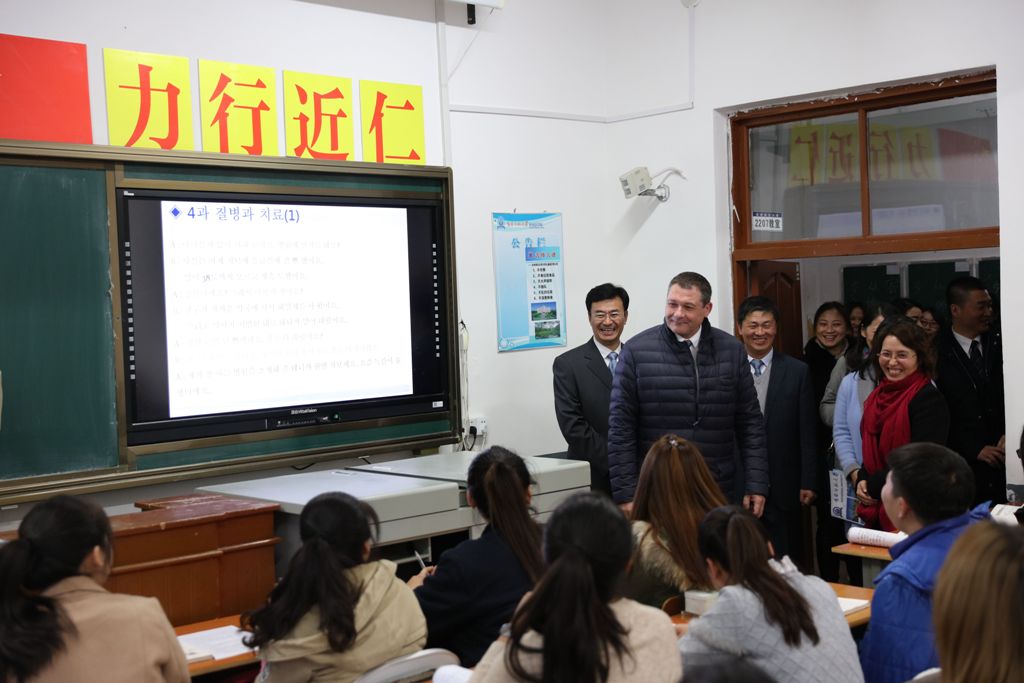 会谈结束后,在许才山和杨景海的陪同下,马克·拉米先生一行参观了我校外国语学院,并与学生进行了互动交流。