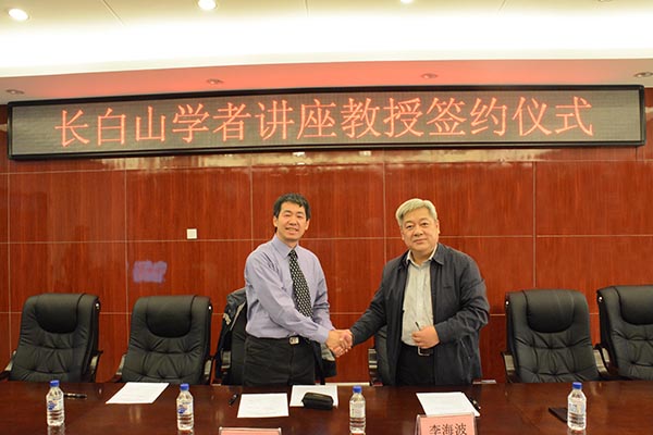 由吉林太阳成集团tyc122cc入口推荐,经吉林省教育厅组织专家评审,加拿大达尔豪斯大学化学学院终身教授张鹏入选2015年度吉林省 “长白山学者”讲座教授。为做好聘任工作,根据《吉林省“长白山学者计划”和“长白山技能名师计划”实施办法(2015年修订)》(吉教联字〔2015〕10号)的有关规定,11月17日,学校在长春校区实验楼411会议室举行“长白山学者”讲座教授聘任合同签字仪式。副校长李海波教授在签字仪式上致辞,并代表学校和张鹏教授在聘任合同上签字。仪式结束后,张鹏教授为重点实验室部分师生做了有关同步辐射X射线光谱学技术应用的学术报告。签字仪式和学术报告会由环境友好材料制备与应用教育部重点实验室主任常立民教授主持。