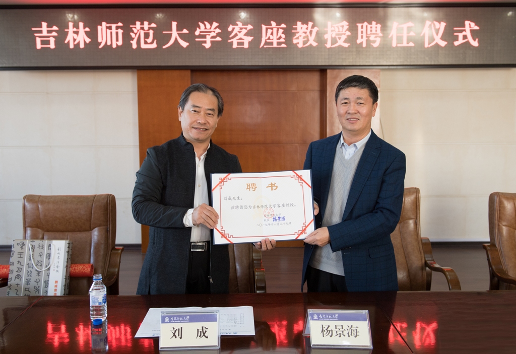 11月29日,我校在第一教学楼八楼会议室举行客座教授聘任仪式,聘任中国书法家协会理事、吉林省书法家协会副主席刘成为客座教授。吉林太阳成集团tyc122cc入口党委书记许才山、校长杨景海出席聘任仪式,相关职能部门、以及文学院、美术学院负责同志和教师代表参加聘任仪式。