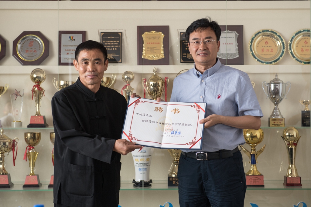 6月29日,我校在体育学院会议室举行客座教授聘任仪式,聘任中国深州李老能形意拳第六代传人,天津武林百杰,天津市级非物质文化遗产形意拳传承人于纯海先生为客座教授。校党委书记许才山,党委常委、副校长张作岭出席聘任仪式,许才山为于纯海先生颁发聘书。四平市武术协会、体育学院师生参加了聘任仪式。聘任仪式后进行了传统武术进校园交流与指导活动,于纯海先生及随行人员、四平武术协会人员进行了相关表演,于纯海先生及弟子为体育学院武术队学生进行了形意拳的教授与指导。