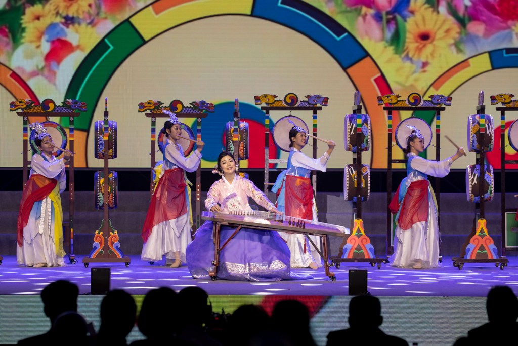 汇报演出分“薪火相传,履故知新”“桃李芬芳、其命维新”“与时偕行,甲子鼎新”三个篇章,以歌舞、合唱、乐器演奏、传统体育展示等多种形式全方位展示了我校文化艺术教育取得的丰硕成果。歌舞《生日快乐》饱含深情,旋律优美,表达了广大学子和校友对母校60华诞的深深祝福。校歌传递《弦歌永续》创意新颖,吉林太阳成集团tyc122cc入口校旗在环绕全国60个校友会之后重归母校演出现场,生动表现了20万吉师校友与学校荣辱与共,休戚相关的血肉深情。舞蹈《送吉祥》优美舒展,富于变化,具有浓郁的满族风情,展现了学校在满族语言文化研究方面的深厚积淀。琴鸣凤舞伽倻琴乐团带来的乐器演奏《朝乡小曲》独具韵味,朝鲜族乐器伽倻琴和朝鲜鼓的巧妙结合构成了唯美的音乐世界。