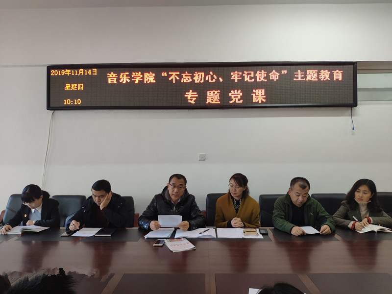 11月14 日,音乐学院党总支举办“不忘初心,牢记使命”主题教育专题党课学习活动,校党委“不忘初心、牢记使命”主题教育领导小组第2巡回指导组副组长、学生处副处长籍卓佳到会指导,院党总支书记陈明宏主持,学院领导班子成员和全体师生党员、科级干部参加了党课学习。