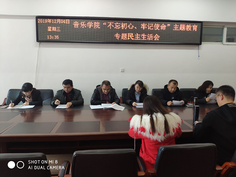 2019年12月4日下午,音乐学院党总支在音乐楼三楼党员活动室召开“不忘初心、牢记使命”主题教育专题民主生活会,校党委第二巡回指导组副组长、学生工作部副部长籍卓佳到会指导,党总支书记陈明宏主持,学院领导班子成员和科级干部、总支委员参加会议。