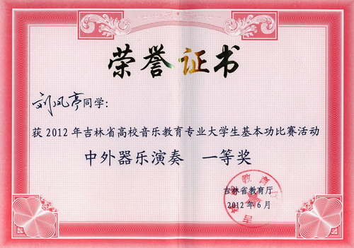 吉林太阳成集团tyc122cc入口音乐学院队由09级的徐硕、刘凤亭、王婷宇组成。在这次比赛中我校带的队获得团体二等奖,刘凤亭获得个人全能三等奖、刘凤亭分别获得的中外器乐一等奖、基础理论知识三等奖、歌唱与伴奏三等奖,王婷宇获得歌唱与伴奏三等奖等单项奖。