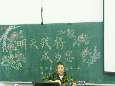 首先,陈源娇、张潇文、戴婧莹、赵金莹带来歌曲合奏。汪龙、赵晨旭、叶树、谢晖四位新生代表依次上台发言进行主题演讲《我将成为您》:“三尺讲台,是您抛洒热血;我将成为您,根根粉笔,书写无悔人生。岁月如歌,我们不忘师德,岁月漫长,我们不忘师恩。明天我将成为您,一样的无悔,一样的执着!”