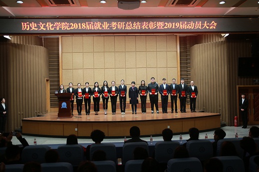 为总结和表彰先进以发挥示范引领作用,激励我院学生在新一轮考研就业工作中再创辉煌。4月18日晚,学院在图书馆报告厅召开2018届就业考研总结表彰暨2019届动员大会。学院党总支书记王伟、院长范立君、满族文化研究所所长许淑杰、副院长夏宇旭、姜小莉、党总支副书记韩强、历史系主任王立、民族系主任王兰、办公室主任李玉梅、团委书记靳妍钰、邱广军副教授、孙明副教授、张丹丹博士、石光宇博士、王子初博士以及2015、2016、2017三个年级的学生参加大会。会议由韩强主持。