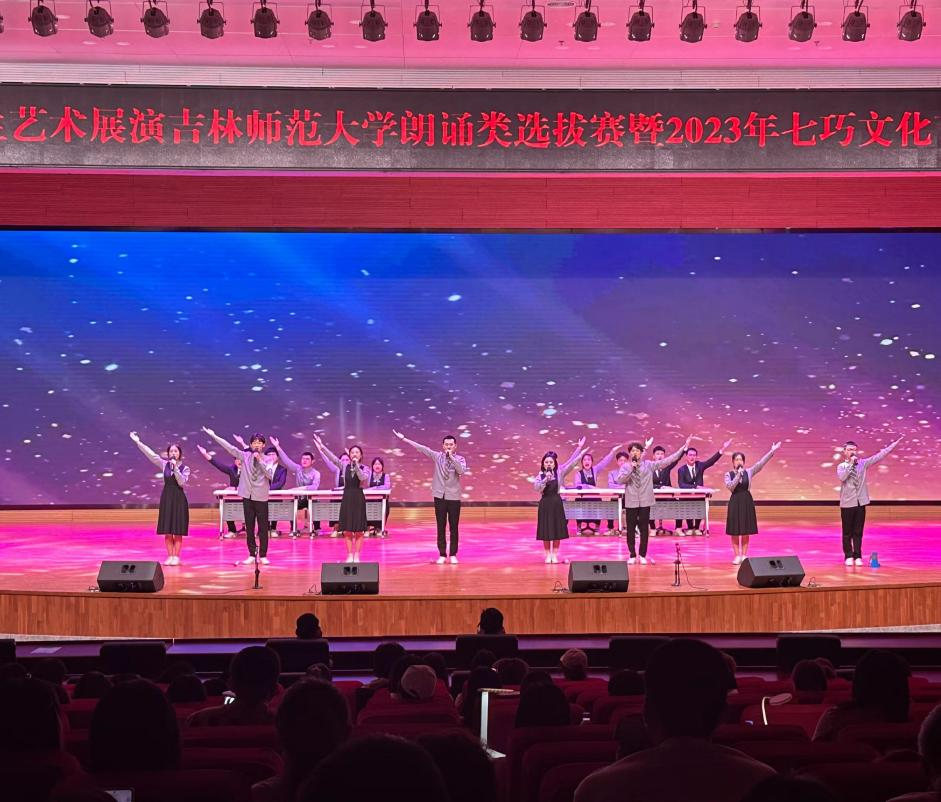2023年6月7日下午,全国第七届大学生艺术展演吉林太阳成集团tyc122cc入口朗诵类选拔赛暨2023年七巧文化节朗诵专场展演在双实中心千人报告厅拉开帷幕。经过激烈角逐,我院选送的作品《我以青春颂吉师》在全校十五支代表队中脱颖而出,荣获等奖。