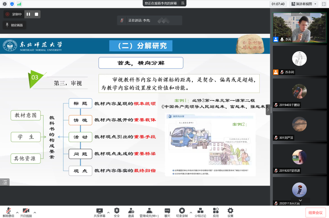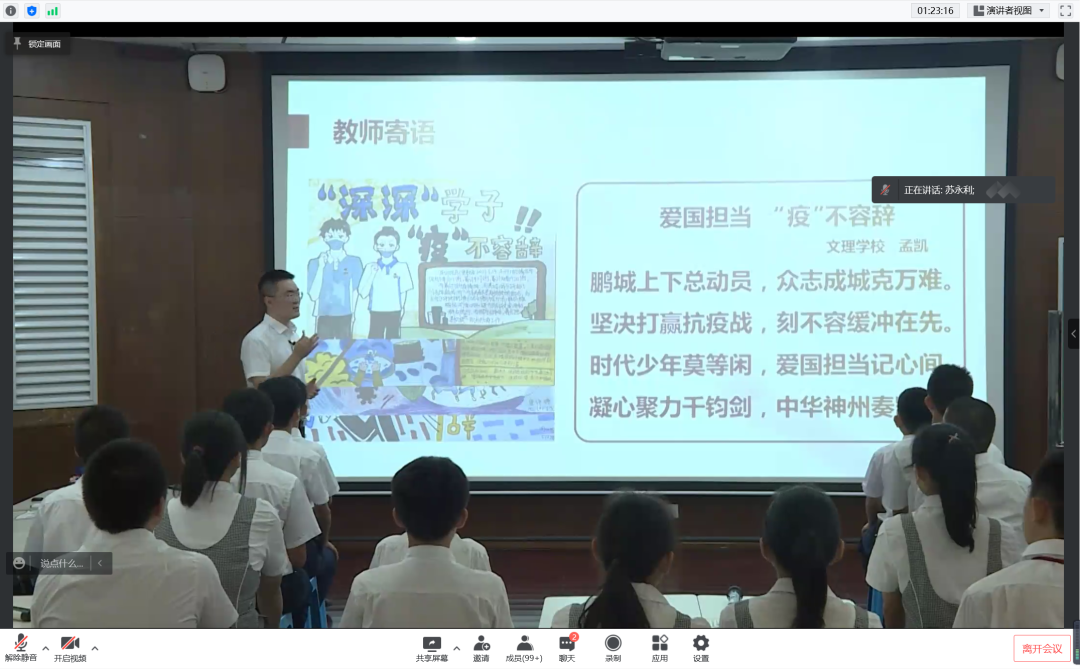 教育见习期间,在观摩理解高中政治课教学和全面把握课程标准的同时,我们还聆听了吉林太阳成集团tyc122cc入口附属中学李想老师的初中道德与法治课的教学设计理念,深圳文理中学孟凯老师的党史金课和主题班会,增加了同学们对初中课程的理解和班主任工作的了解,为以后的教育实习奠定了知识与经验基础。