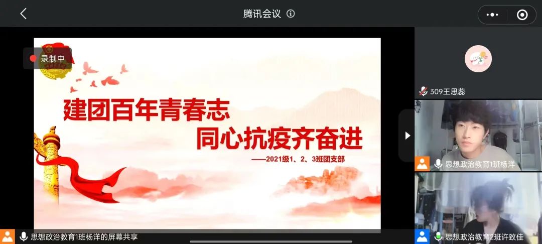 三个年级都在团日活动中积极举办团史知识竞赛,同学们积极参与,在活动中展现和丰富对自己对共青团的认识和了解:介绍入团仪式基本程序,讲团史故事,传承红色基因。此次团日虽然是线上模式,但也精彩纷呈,同学们悉心准备节目,共同带来了一场别开生面的线上团日。马博驰带来了朗诵《燃烧》,许必锐、陈雨、吴思璇带来了朗诵《忆百年荣光,普青春华章》,在朗诵时铿锵有力的一字一句里展现着青年团员对共青团的追随和热爱。