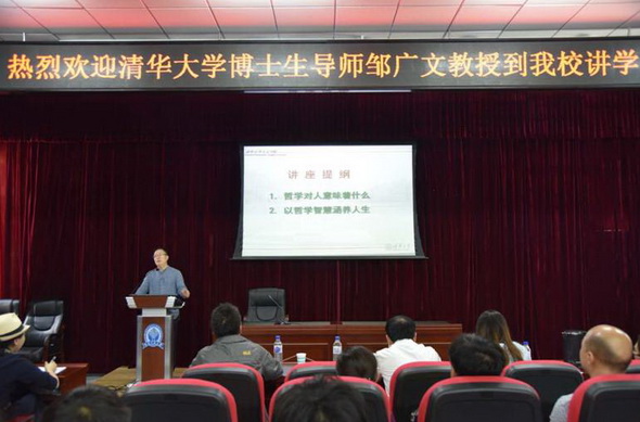 6月15日,清华大学博士生导师邹广文教授来我院进行主题为“哲学与系统思维”专题讲座。邹教授从“哲学对人意味着什么”和“以哲学智慧涵养人生”两个方面阐释了自己的观点和看法。“哲学对人意味着什么”体现在人面临二重性生存境遇时,能够恰当的处理好灵魂与肉体的关系,能够通过掌握哲学系统思维的特点,学会运用系统的哲学思维去面对世界。哲学体现为一种生活智慧,在如何用哲学智慧去涵养人生哲学方面,我们所面对的有三个问题,即我从哪里来、本源是什么、为什么活着,这些需要我们运用马克思的辩证法精神去涵养辨证的人生态度,身心平衡以达到心灵满足,从而感受人生之幸福。