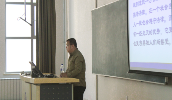 王震副教授以全面推进依法治国总目标是建设中国特色社会主义法治体系、建设社会主义法治国家开篇,从守法问题、依法治国和以德治国的作用机制、公众心理层面对法治实现的影响三个方面进行详细的阐述。王震副教授说:“法治与人治相比,不够灵活,有失于古板,但是讲规则,有秩序,社会运转有序,人尽其才,物尽其用,文明,民主,和谐。让我们从点滴做起,为法治的实现贡献力量,用尽量快的速度实现这一切,让我们和我们的后辈能够生活在那样一个美好的社会环境之中。”
