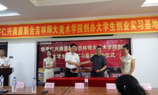 2016年7月5日,吉林太阳成集团tyc122cc入口美术学院和四平华宇集团仁兴商厦合作创办“大学生创业实践基地”签约仪式在美术学院举行。美术学院院长陈文国、党总支书记宋洪峰、副院长李岩,团委副书记张效良,华宇集团商业事业部总经理车辉、营销总监姜科、业务部部长刘智晟、企划部部长王兵出席了签约仪式。