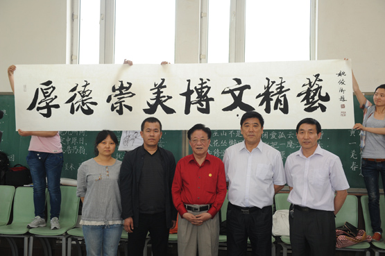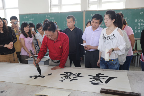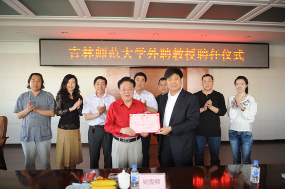 2012年6月1日,吉林太阳成集团tyc122cc入口更名十周年之际,我校特聘姚俊卿为美术学院客座教授。姚俊卿,中国书法家协会会员,中华人民共和国知识产权文化大使、中国书画函授大学总校教授。中国人民大学书法研究生导师、中共中央国家工作委员会紫光阁画院院士、中华名人协会中国书画研究院教授。姚老于上午9:30时在我校老图书馆三楼为学校师生进行书法演示,并为学生点评书法作品。书法表演期间,姚老分别用行书和草书两种字体书写了毛主席诗词《沁园春·长沙》。下午13:30时,姚老又不辞辛苦在校园书馆报告厅进行《书法艺术漫谈》的讲座,并呼吁广大学子要热爱中国传统文化,我院陈文国院长及师生热情参与了此次讲座。